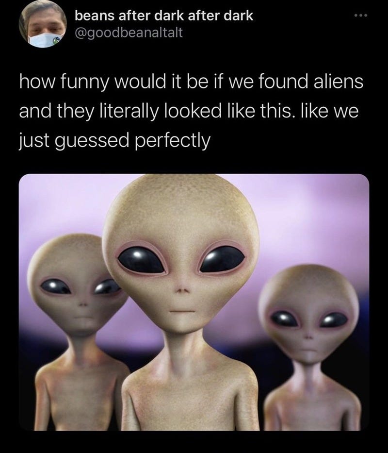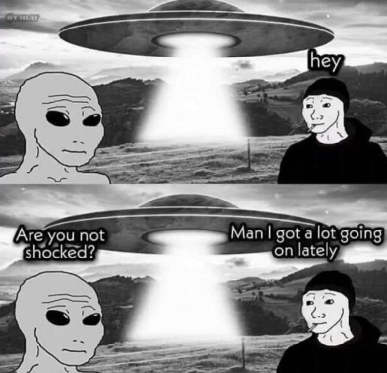 Okay. Now what? Do we get a tax credit? A commemorative coin? A federal holiday? Do the aliens join the UN? Maybe start a podcast? Do they have thoughts on inflation? Do we give them instant citizenship, or are they literal illegal aliens? (And are we allowed to call them that?) Are they liberal or conservative?