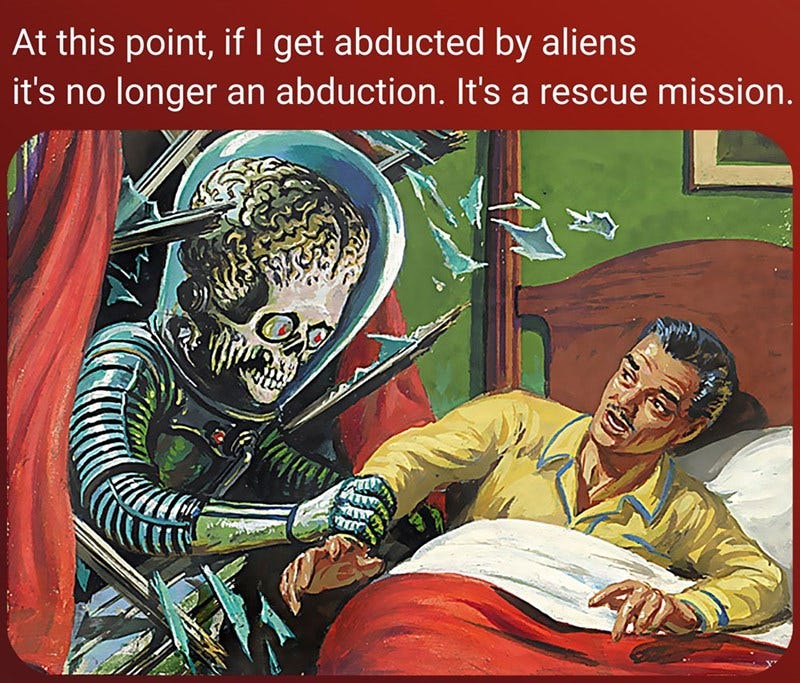 Or maybe—and here’s a heretical thought—maybe the presence of alien life, while cosmically interesting, is more or less irrelevant. Because unless they’re here to conquer, cure, or collaborate, my day-to-day existence does not change in any meaningful way. My bills do not vanish. My cat continues to pee in my sink. Dinner does not magically start cooking itself. And if they are here to conquer, cure, or collaborate… how is that all that different from the human playbook?