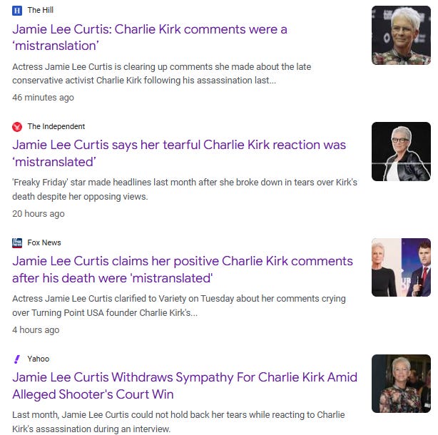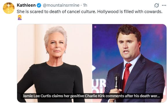 Meanwhile, People wrote a full article explaining that Curtis didn’t actually mean to wish Charlie Kirk well, she just accidentally said words that sounded halfway-civilized. She even managed to slip in a pseudo-philosophical TED Talk about “holding two contradictory ideas”—you know, like being charitable and not wanting your career to die.