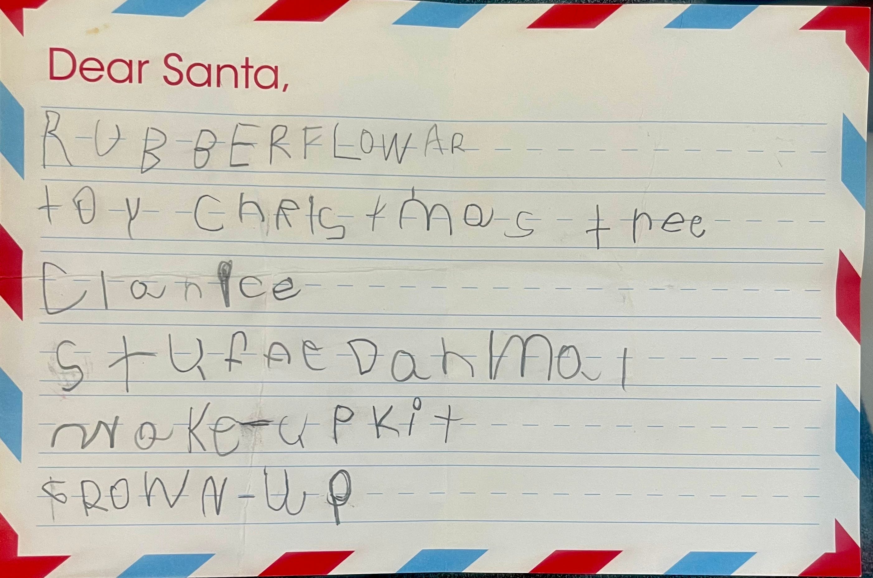 It’s funny and sweet but you guys, these are actual lists my children gave me back in the day from which I was expected to produce Christmas morning magic. I must have spent three weeks trying to figure out where on earth to find the core mog cloos that were going to make her little heart sing. (The pretend phone and Statue of Liberty statue were slam dunks.)