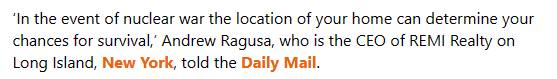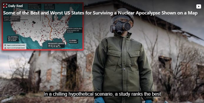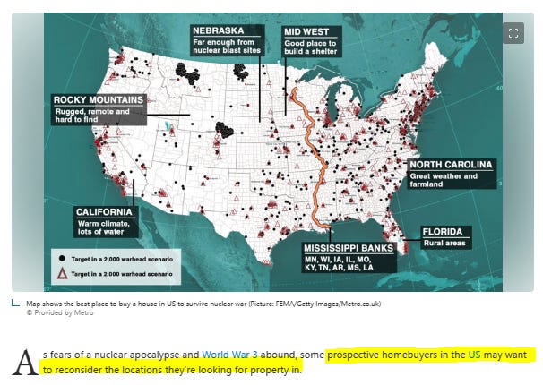 Although the piece is not intended as comedy or satire, I find it hilarious that the grand total of two experts quoted in this nuclear apocalypse survival story are… realtors. Like, the guy who is right now hosting an open house on a 3/2 with extra-large closets, a serene, spa-like master primary bath, and peek-a-boo lake views is the best how-not-to-die authority they could find? (And his red-hot house-hunting tip is, “The elevation of the Rocky Mountains means that fallout would be dispersed more quickly and assisted by higher winds, which could help to minimize any radioactive material reaching the area”? Yeah, but what’s its walk score and is there a decent pizza place that delivers?) They couldn’t throw in, say, a radiation safety expert, a nuclear physicist, a chemical warfare specialist, some badass military dude, or even a TikTok prepper-influencer?