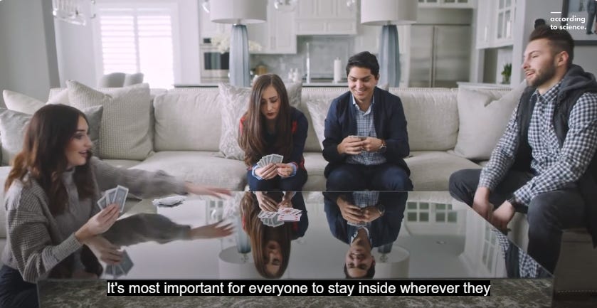 The short PSA, branded “according to science” you cannot make this stuff up, recommends distracting yourself from the death and destruction all around you and your possibly missing family members with a rousing game of Old Maid or Texas Hold ’em.