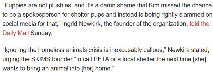 PETA, never one to miss an opportunity to lecture from on high, leapt in with the urgency of a hall monitor who just spotted the class president puffing on a vape pen. “Puppies are not plushies,” their founder scolded, all but suggesting that Kim was moments away from tossing them into a claw machine. PETA’s spokesperson helpfully explained that the billionaire reality-TV matriarch could “make amends” for her egregious gifts by sending her kids to volunteer at a shelter, funding an adopt-a-thon, and possibly sponsoring a spay-and-neuter day. I am not even making that up.