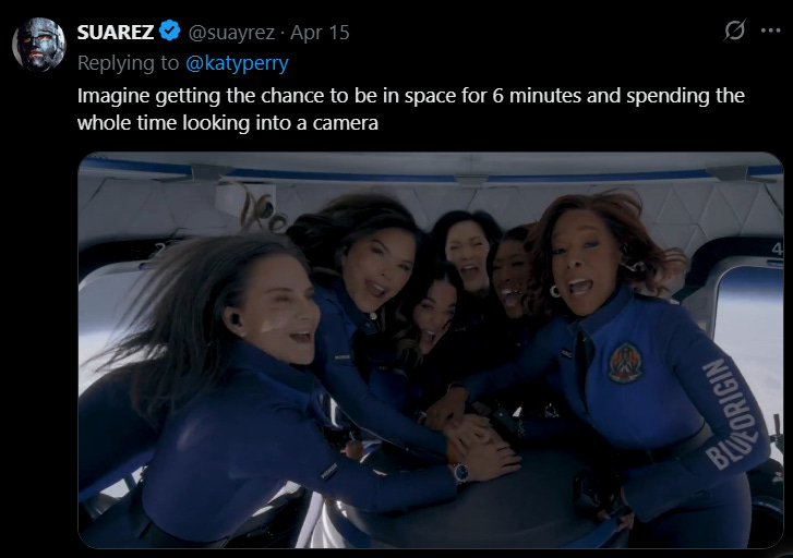 AUTHOR’S NOTE: Did Kamala Harris write that for her? I’ve tried—I promise, I have—to find even a tangential connection between a ten minute, million-dollar joyride and feeling worthy and connected to humanity, but I get nothing. (I don’t think anyone thought that when the pop princess promised to “put the ‘ass’ in astronaut,” she was being literal.) Also, Perry has a child. She’s a mother. But she didn’t know how much love she had to give or receive until she floated in a glorified science fair rocket? Tell me you have prolonged, undiagnosed post-partum depression without telling me you have prolonged, undiagnosed post-partum depression.