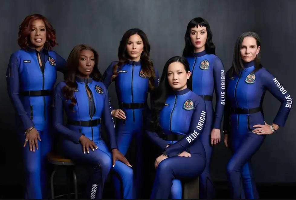 Turns out, it wasn’t a parody. The photo was hyping Perry’s participation in Blue Origin’s latest mission to the outer reaches of... mild altitude. The private aerospace company, owned by none other than Jeff Bezos (what is it with billionaires and their rockets these days anyway?) specializes in quick but flashy space travel for the rich and photogenic. Yes, the songstress who famously kissed a girl and liked it and then wrote a song about it and got mega-famous for it was launched a whopping 62 miles above Earth this week—which, for perspective, is almost the exact distance I once walked to fundraise for breast cancer. Also along for the ride were TV personality Gayle King, journalist Lauren Sánchez, and a supporting cast of women who work in STEM and/or are incredibly wealthy and/or have excellent publicists.