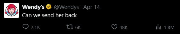 Instead of backpedaling after a decidedly mixed reaction to the tweet, Wendy’s doubled down—launching a #SendHerBack campaign and rewarding any user who replies with the hashtag a free Frosty.