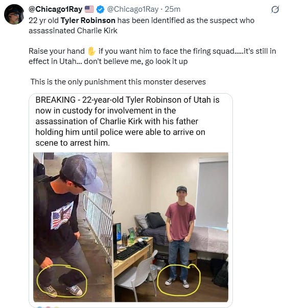 Call me crazy, but this has all the hallmarks a professional hit. The kind of “clean” execution you don’t get from a random sophomore with a free weekend and a grudge. Yet the FBI, local police, every major media outlet, the president and vice president, Charlie’s own widow, even “alternative” journalists like Alex Berenson and 2nd Smartest Guy, are reporting or accepting Robinson’s guilt as fact. We found the guy! Phew. Curtain closed. Don’t forget to tip your servers.