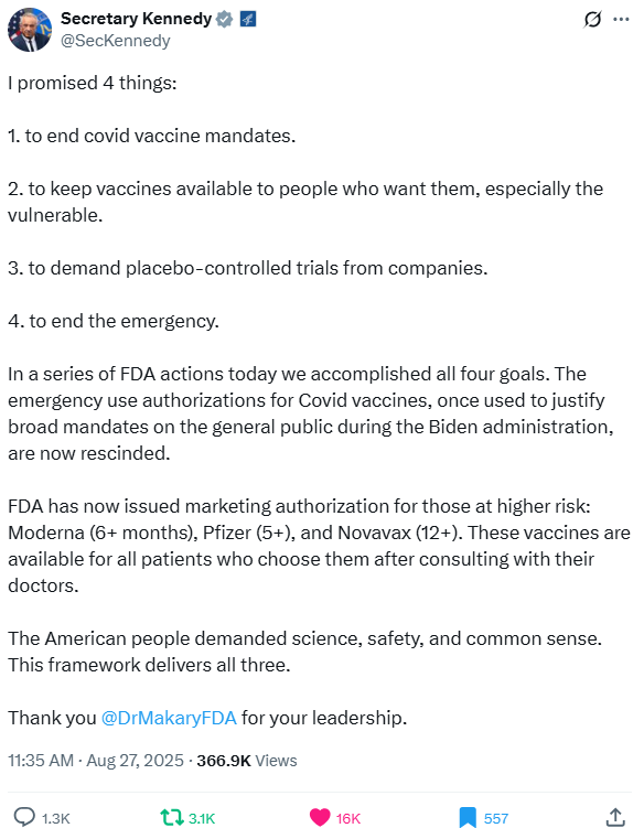 So yes, technically, the FDA “approved updated Covid-19 vaccines.” But the truer headline is this: Mandates are dead. Jabs are optional. The panic-industrial complex just blew its most critical fuse.