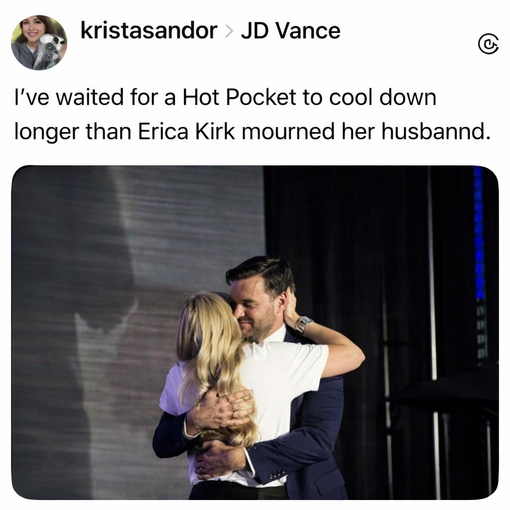 P.P.S. I know some of you do not believe that Charlie Kirk was, in fact, murdered—because in your worldview nothing is real, everything is theater, and the rest of us are gullible extras in the Great American Psyop. I see you. I acknowledge you. No need to take on the agonizing burden of enlightening the rest of us in the comments. Really. Thank you for coming to my TED talk.