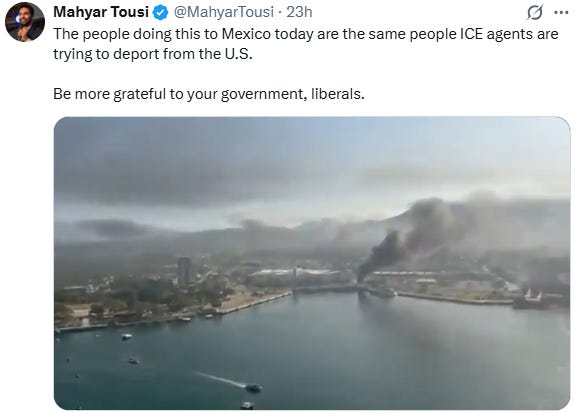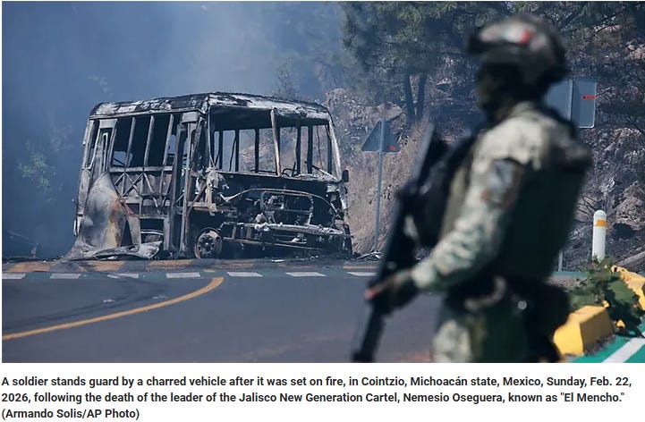 The drama began on Sunday when Mexican special forces—guided by U.S. intelligence—finally took down Nemesio Oseguera Cervantes, or “El Mencho,” the crime boss who trafficked fentanyl into the U.S., shot down military helicopters, planted landmines, and dropped explosives from drones. As one might imagine, the Jalisco New Generation Cartel (CJNG) was not happy with the sudden, unexpected restructuring of its executive suite.