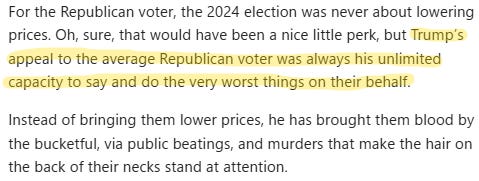 According to this theory, tens of millions of Americans didn’t vote MAGA because of inflation, taxes, immigration, energy prices, foreign policy, Bobby Kennedy, or dear-God-anyone-but-Kamala. They voted MAGA because they have an insatiable appetite for slaughter and they knew that Trump would deliver it! No, really. That’s the argument. As if the entire Republican electorate is huddled behind Trump like fourth graders cheering on the school bully: “Come on, we want to see blood!”