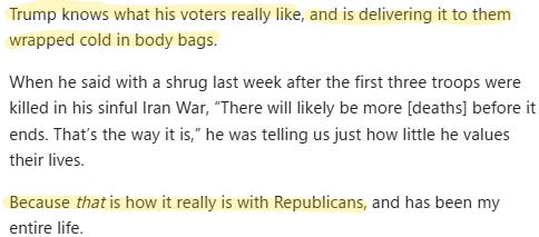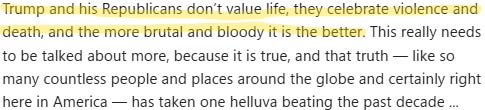 “We are a nation at war with itself… because that is exactly how the Republican Party likes it. Violence, war and hate are their hallmarks, and the only things they have consistently delivered to the American public for the past 75 years. There is nothing new about any of this, except that they’ve finally found a leader who can provide all that with a smile on his face.”