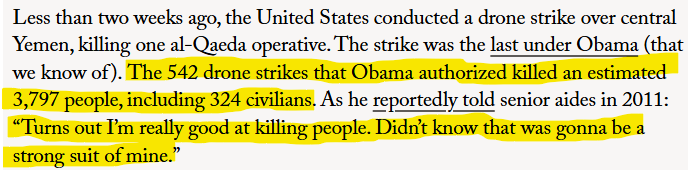 Then there’s Barack Obama—the Nobel Peace Prize President!—who oversaw military operations in Libya, Syria, Iraq, Afghanistan, Yemen, Somalia, and Pakistan. His administration dramatically expanded drone strikes across the Middle East and Africa, reportedly holding weekly White House reviews of individuals nominated for targeted assassinations—what critics dubbed the “kill list.” According to The New York Times, when it came to authorizing lethal action against an American cleric in Yemen, Obama reportedly told colleagues the decision was “an easy one.”