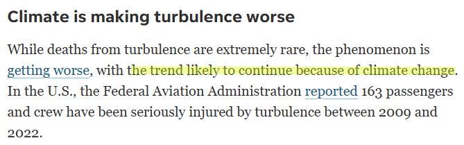 So, to recap: Clear air turbulence, which is turbulence that occurs in clear air, is becoming more frequent and more intense because the turbulence, which is now more turbulent, is increasingly and intensely more frequent due to climate change, which is changing the climate.