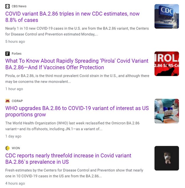 Which brings us back to BA.2.86. The latest figures released by the CDC claim the strangely named V of I [author’s note: Did we run out of Greek letters? Did I miss Zeta, Iota, and Omega Beta Theta Sigma (OBTS)?] is estimated to make up 8.8% of recent COVID cases, up from 3% at the last count two weeks prior. (Figures likely based on tests that don’t work and never did, but semantics.) It’s “virtually triple,” the reports breathlessly claim, before admitting that the variant does not appear to lead to worse or even different symptoms than any previous strain and acknowledging—as this CBS News story did—that the CDC “did not disagree” with the WHO's assessment that BA.2.86 does not pose a significant health risk, nor does it appear to be driving increases in infections or hospitalizations.