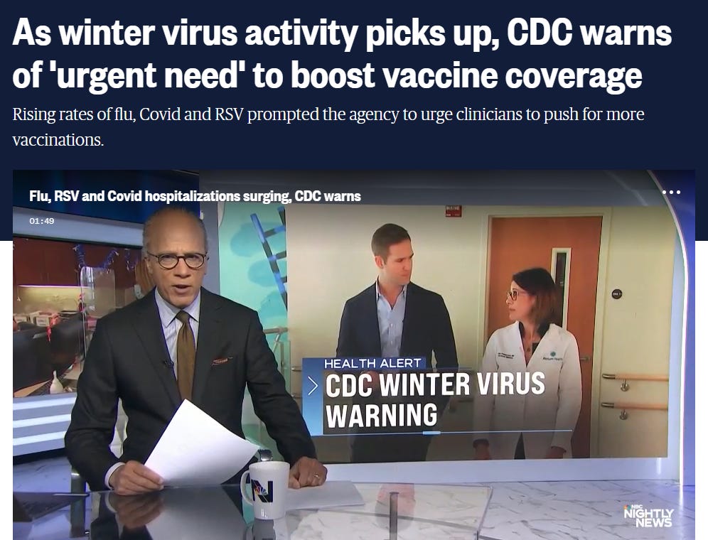 “The CDC emphasized the importance of staying updated on vaccinations against respiratory viruses.” Wait, they did? Shocker! I never saw that one com— “Beyond COVID-19 and influenza, a global uptick in pneumonia cases in children is also under scrutiny, officials asserted.”