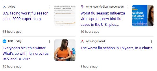 I have a screenshot of screaming headlines from every year from 2018 back 10 years saying about the same things. Hospitals full, cases surging, epidemic worthy, everybody sick. I think I had my first hard flu since 1998 after Christmas with nothing but maybe 1 or 2 flu shots in between. Quit that folly long ago. I understand this years jab effectiveness is worse than placebo. 🤣🤣🤣🤣🤣🤣🤣🤣🤣🤣🤣🤣🤣. I don’t test for Covid. Another joke.