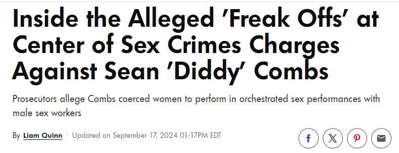 The first I heard of Diddy’s most recent dallying was in an article in People magazine, a “quote-filled” “story” that used the newly trendy term “freak off” no fewer than eleven times [*mentally flushes eyes with bleach*].