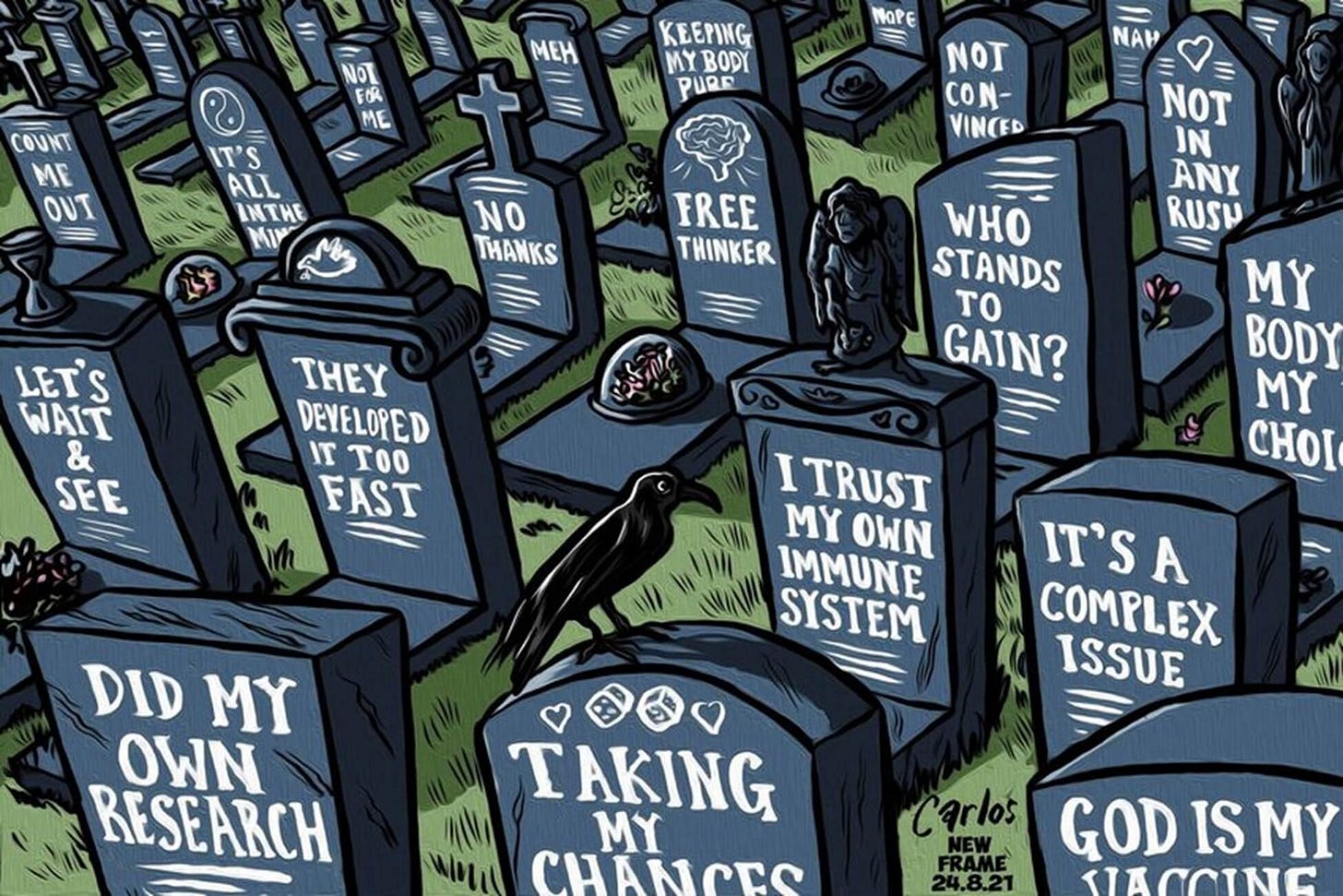 I have shared it before, but it will never cease to infuriate and appall me. I am far from the most politically correct person you’ll ever meet; odds are I’m not the number-one nicest. Still, never-not-ever would I callously post an anti-vax version of this smug sketch with tombstones reading, “I FOLLOWED THE SCIENCE™” and “MY SUPER RARE SIDE EFFECT WAS DEATH.”