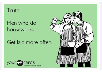 This is not a quantum leap. Just last year, a fascinating study found that the more household chores people do the more sex they have. (Go ahead, put the book down and go tell your husband that. I’ll wait.) Now, had the study focused exclusively on how housework pays off for otherwise reluctant-to-clean guys, of course the findings would have made perfect sense. I am pretty sure I’d be willing to give it up on the spot if I saw Joe wielding a Swiffer or emptying the dishwasher of his own accord. But here’s the part that stumped me: The study found that for both men and women, more housework equals more sex.