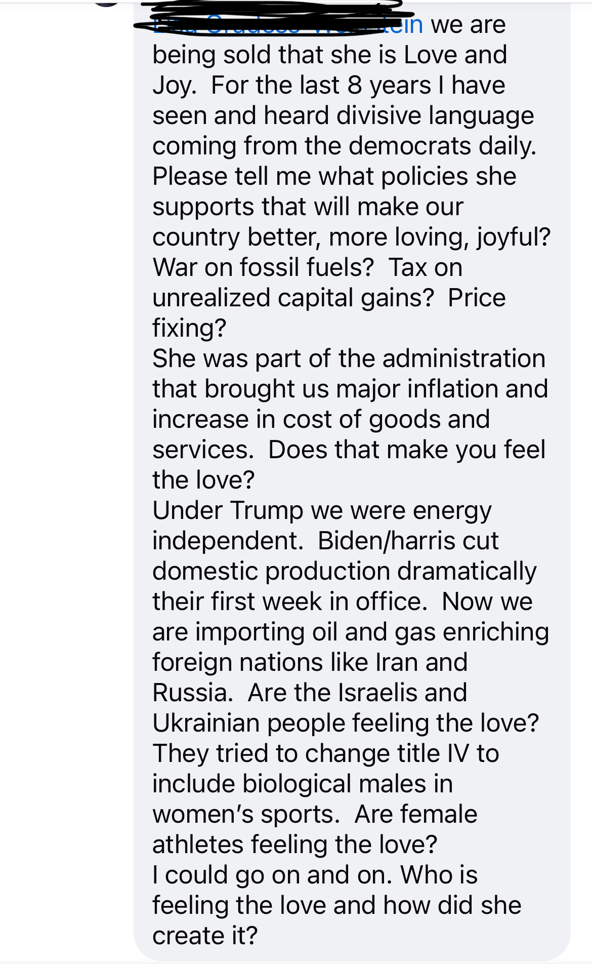 Love him or hate him [or convinced it doesn’t matter because it’s all a façade anyway so you refuse to play the game at all (hi, Vee!)], there’s little ambiguity or speculation when it comes to Trump’s policy positions. He’s promised he’ll end the war in Ukraine within 24 hours of taking office, complete the border wall, reform the CIA and the FBI, overhaul the Affordable Care Act, and make America energy independent again. Call me gullible, but I at least believe he wants to do all of these things. (Sure, he didn’t drain the swamp or—unfortunately—put Hillary behind bars last time, but he did expand military funding, strengthen our national defense, lower taxes, turbocharge the economy, create jobs, and try to pull us out of the WHO, a move Biden blocked as soon as he took office *go figure. We could afford food and gas and I don’t know about you, but not once during his term did I google how to survive nuclear war.) And with RFK Jr. officially tapped as part of Trump’s transition team, don’t even get me started on how optimistic I feel about the future of our food and our bodily autonomy should Kamala please God, pretty please with cocaine sprinkles on top end up with a participation medal in these turbulent electoral Olympics.