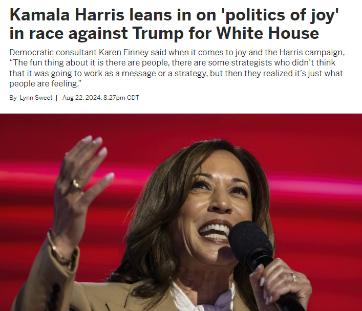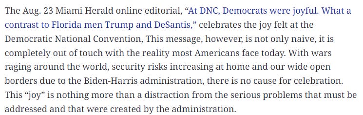 The Miami Herald ran an opinion piece yesterday titled, Message of ‘joy’ at Democratic Convention hides Kamala Harris’ poor track record, and I want to kiss the author smack on the lips. From the intro: