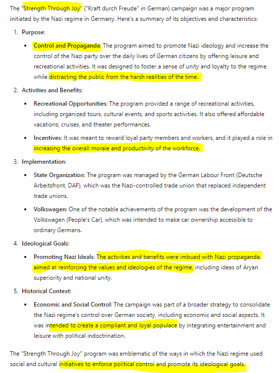 It’s also worth noting—although Reuters insists that any connection to Kamala’s campaign is 100% fake news—that Strength Through Joy was actually a popular Nazi propaganda initiative. From my research assistant (ChatGPT):