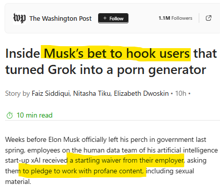 Yesterday, WaPo exclusively reported that Musk’s artificial intelligence company xAI—in a race to capture the increasingly competitive chatbot market—allegedly asked employees to sign waivers acknowledging they would be exposed to “sensitive, violent, sexual and/or other offensive or disturbing content.” In other words, using non-HR language, “you’re going to hear things you can’t un-hear and see things that might require extensive therapy to process.”