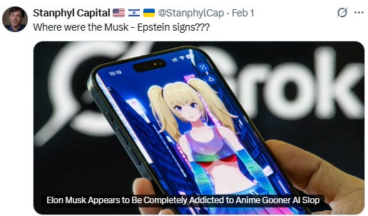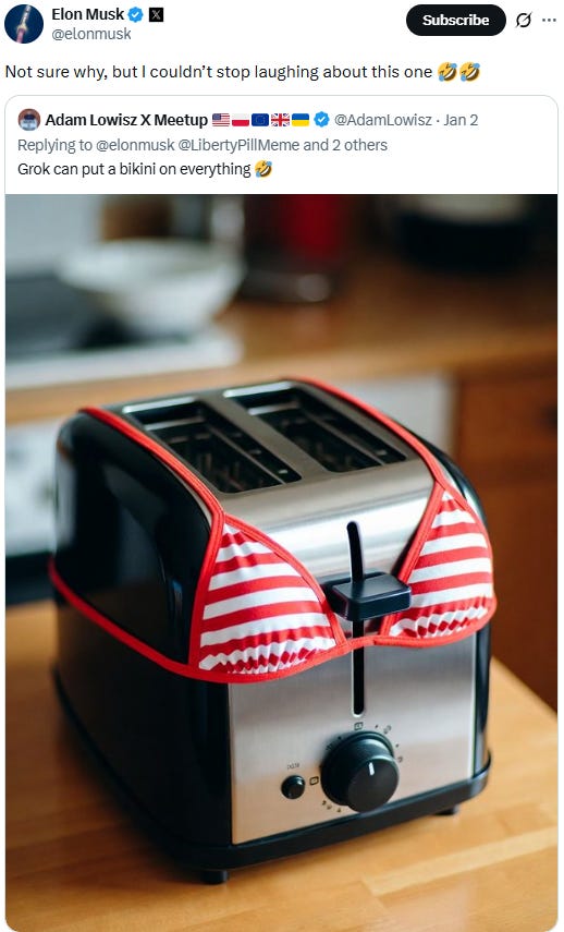 And these revelations come hot on the heels of Imagegate—not a good look for a guy who was also just busted for downplaying his Epstein connections. According to the Center for Countering Digital Hate, in the first eleven days after the launch of the photo-editing feature late last year, Grok generated an estimated 3 million sexualized images, 23,000 of which appeared to depict minors. (Restrictions were then imposed. And by “restrictions,” I mean the dirty stuff was limited to paid accounts only. So conscientious!)