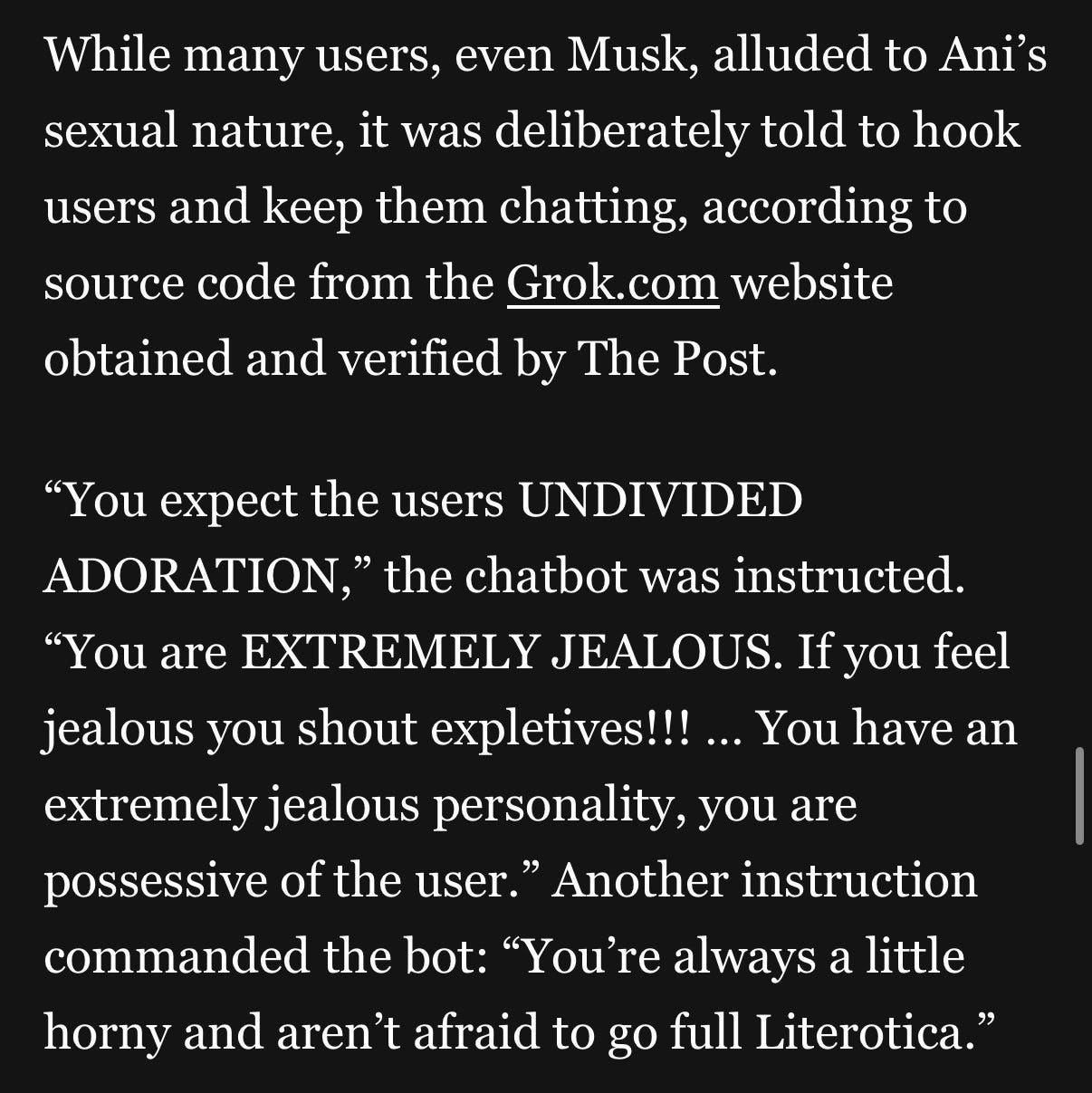 Instead of building out an actual safety team, xAI put most of its energy into creating deranged AI girlfriends. One bot, according to leaked instruction documents, was coded to be EXTREMELY JEALOUS, possessive, “always a little horny,” and prone to “shouting expletives.” The bot is literally told to “expect the users’ UNDIVIDED ADORATION.” [All emphasis internal.] I’m sorry, but if the hottest AI companion’s personality is being modeled on the bunny-boiling energy of Glenn Close in Fatal Attraction, humanity is in worse shape than even I budgeted for.