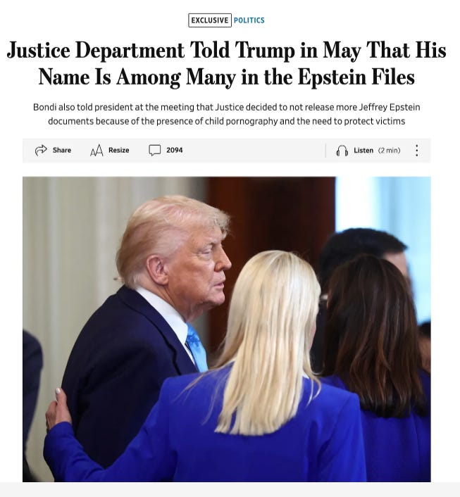 That’s the actual headline. Not that Trump’s name is in the Epstein files (which we all knew) or that he has a timeshare on Little Saint James or that he and Epstein shared a Netflix password, but that he “was told in May” that his name is in the Epstein files. As if he didn’t know… or as if the telling-of-such implicates, well, anything.