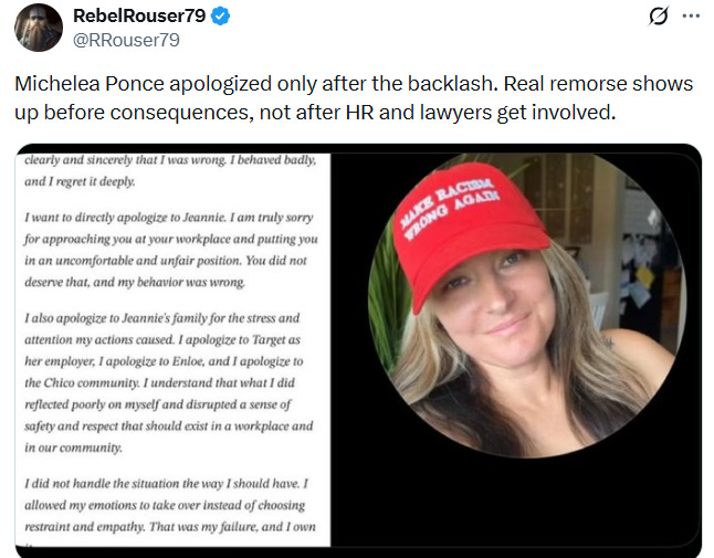 After a supposed investigation, Chico police determined that “the actions of the woman recording the video do not meet the threshold for criminal acts.” (But a thirteen-year-old kid can get arrested for passing gas in a classroom and then turning off his classmates’ computers? Tell me our “justice system” is broken without telling me it’s broken.) Meanwhile, Michelea deleted her entire digital existence and then issued a forced, too-little apology that social media had exactly zero time for.