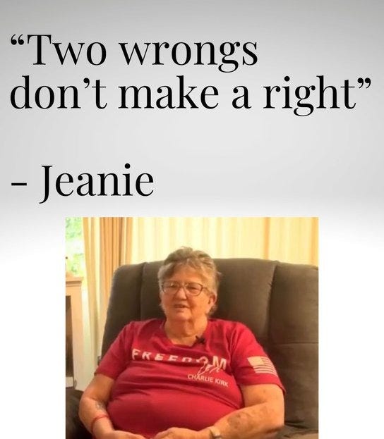 A thoughtful journalist launched a GiveSendGo to “send Jeanie on a much-needed vacation;” when it quickly soared into six figures, the goalpost shifted to “let’s help Jeanie retire.” She went from stacking khakis under fluorescent lights to being celebrated as the accidental patron saint of poise, courage, and being the bigger person. And just when you thought the story had peaked, Turning Point USA did what it does best: it leaned all the way in.