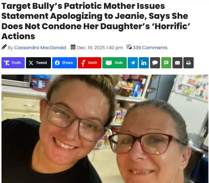 The confrontation is painful to watch. Michelea—who apparently fancied herself an “anti-racist activist” before torching her entire life—is belligerent, profane, and completely unhinged by the sight of a T-shirt. Jeanie, meanwhile, is calm, polite, and unfailingly gracious—answering abuse with composure, refusing to escalate, and ending the exchange by sweetly wishing her attacker a nice day before walking away. It’s less a confrontation than a character study: what happens when pure crass meets dignified class.