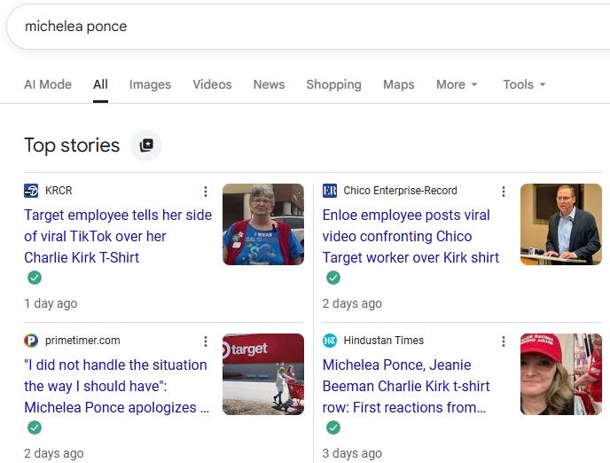 In case you missed it: for reasons explicable only to someone who specializes in severe mental disorders, a woman named Michelea Ponce marched into a Target store in Chico, CA, and filmed herself unleashing a profanity-laced tirade against an elderly employee named Jeanie Beeman. Jeanie’s hideous offense? Wearing a Charlie Kirk “FREEDOM” shirt on the job. The clip—intended, one assumes, to shame Jeanie into ideological compliance—instead became a master class in consequences.