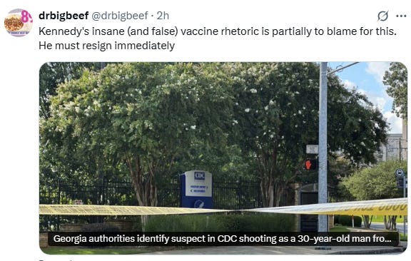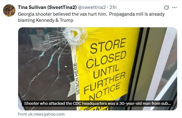 “Investigators say that the man who opened fire on the headquarters of the US Centers for Disease Control and Prevention (CDC) in Atlanta, killing a police officer, may have been opposed to Covid vaccinations,” is how the BBC opened their coverage. (He may also have been opposed to cargo shorts, synchronized swimming, and fondue; he’s unalive so we’ll never know.)