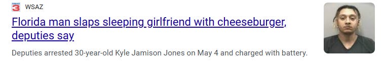 To my knowledge there’s no Massachusetts Man (or Wyoming Woman) game, but if you’re from south-of-Dixie, you’re fluent in Florida Man. For newbies, Florida Man is simple: type “Florida Man” plus your birthday into the Google search bar and see what headline pops up first. Spoiler: it’s always something like “Florida Man Stabs Roommate Over Toaster Strudel” or “Florida Man Chows Down on Cheesecake in his Underwear in the Middle of the Everglades”.
