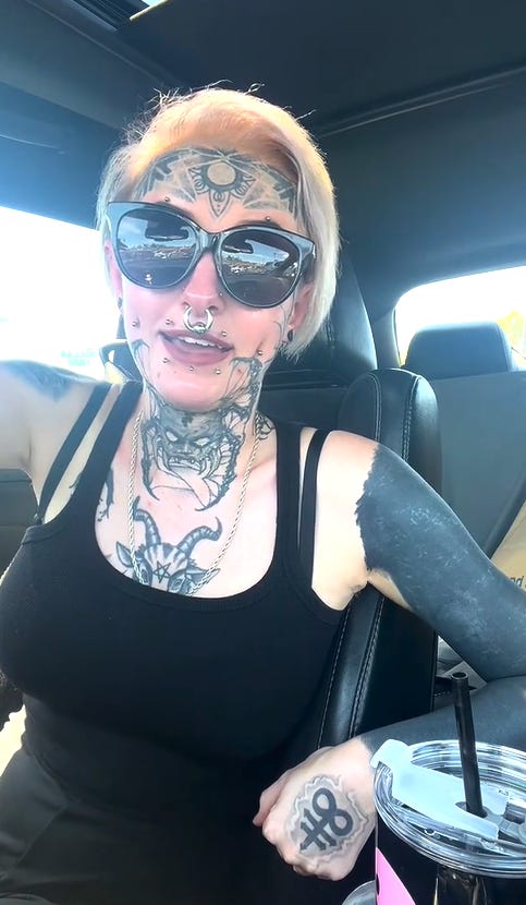 Let’s dissect that a bit. So Ash already has a tiny inkling that maybe the sinister looking spider strangling her neck and creeping up her cheeks or the patently satanic Baphomet peeking out from her between her bosoms (not to mention the dozen-plus decorative baubles she’s had stabbed into her face) could conceivably be hindering her job search. Perhaps this is the early stages of what’s known as a “rude awakening;” an introduction to the idea that our personal choices could potentially have—gasp!—consequences?