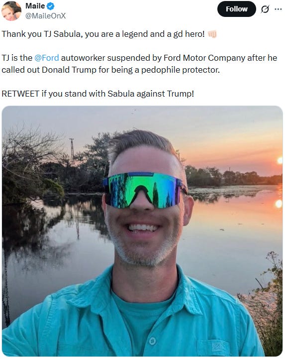 This week’s exemplar: a Ford employee named TJ Sabula heckled Trump during a visit to a Michigan plant and was subsequently suspended for it. Within hours, strangers on the internet had hurled hundreds of thousands of dollars at the father, husband, and “proud United Auto Workers Local 600 line worker” like he’d just unlocked a never-before-seen level of valor.