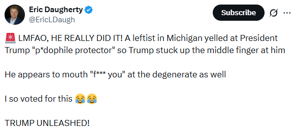 This isn’t about defending Trump’s decorum. I think we can all agree he has none. Do I wish the guy with the nuclear codes could summon a little self-restraint in public? Of course. Would it be great if “don’t flip off agitators at work events” were a low bar we could clear? Yes. But Trump being Trump isn’t the story here. The story is what the internet chooses to reward.