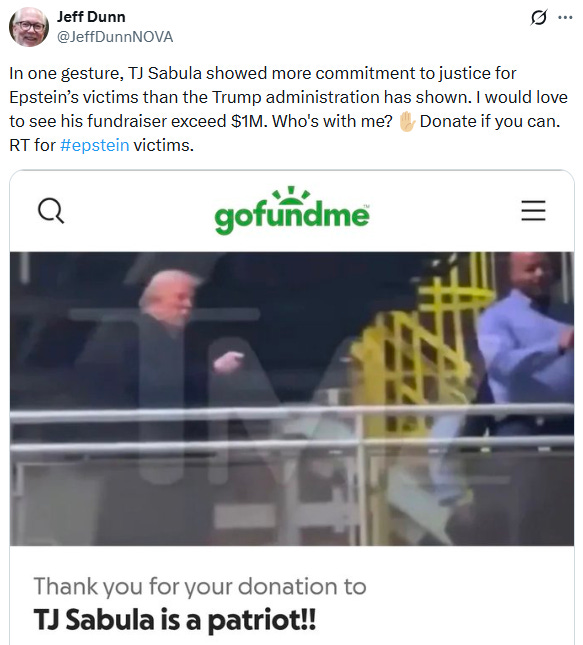 Within a day, two GoFundMe campaigns for Sabula had raised nearly a million dollars. The campaigns were abruptly paused, with organizers offering a polite thank-you and no real explanation beyond encouragement to “support other causes.” (Possibly because they were raising more eyebrows than dollars? IDK.)