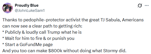 There are probably people who work at that same plant who have been laid off, injured, or are struggling to keep their heads above water. There are likely families buried under medical bills. There may be parents choosing between groceries and prescriptions. None of them trend. None of them get a campaign titled “Let’s Rally.” But rib the right villain, and suddenly you’re a working-class hero with a six-figure cushion and a union press release defending your “voice.”