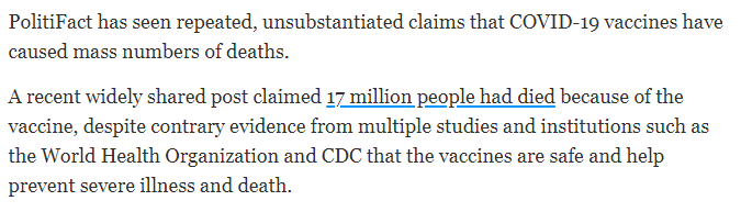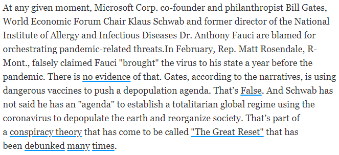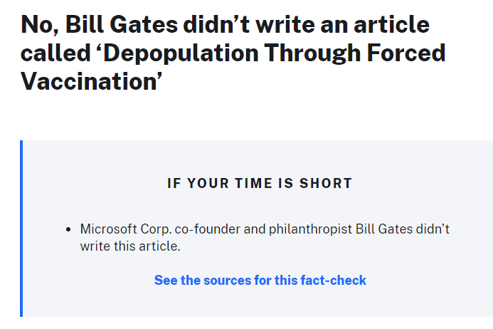Read that again: “Gates, according to the narratives, is using dangerous vaccines to push a depopulation agenda. That’s False.” I’ll save you the trouble and the existential aggravation of clicking on that “false” link and just show you how thoroughly and diligently PolitiFact debunked that particular conspiracy theory: