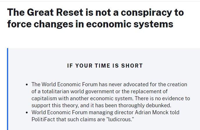 Oh, you silly right-wingers. The WEF has never advocated for the creation of a totalitarian world government! Well, except that one time—literally right now—they were (are) promoting the WHO Pandemic Treaty which would give an unelected group of leaders unrestricted power to declare pandemics and regulate the global pandemic response. Oh, and that other time—literally the day the pandemic was announced—that they partnered with the WHO to launch “an emergency coronavirus task force.” And then there was the time WEF Quarterback Klaus Schwab announced, “The people assume we are just going back to the good old world and everything will be normal again... This is, let’s say, fiction. It will not happen.” And of course, that time every other day that Schwab hails the arrival of the New World Order. Other than these published, verifiable facts, any claims that the Great Reset is trying to force a change in the world economic system are, to quote some dude who works for the very group that routinely admits they’re trying to force a change in the world economic system, “ludicrous.”