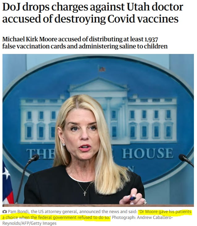 This weekend, Bondi—fresh off a public flogging over her inability (reluctance? unwillingness? refusal?) to produce long-promised “truckloads” of Epstein files—shut down the federal government’s prosecution of Dr. Kirk Moore [aka The Most Politely Rebellious Doctor in Utah] like a blanket full of fake Louis Vuitton bags on Canal Street.