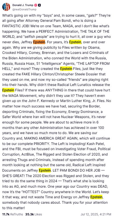 In the wake of the disappointing Epstein List non-bomb, it looks like Attorney General Pam Bondi is trying desperately to save face with (what’s left of) her base.