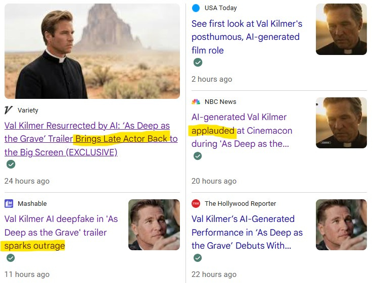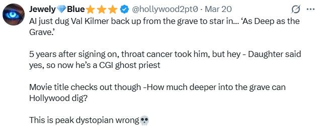 What about the (meaningless) Oscars? What if AI Val is nominated? What category? Best Performance by a Dead (AI) Actor? Who accepts the Oscar if AI Val wins?