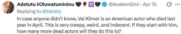 To be clear, his children signed off. SAG-AFTRA signed off. The lawyers signed off. The contracts were followed. The boxes were checked. Nevertheless, the audience is preemptively offended.