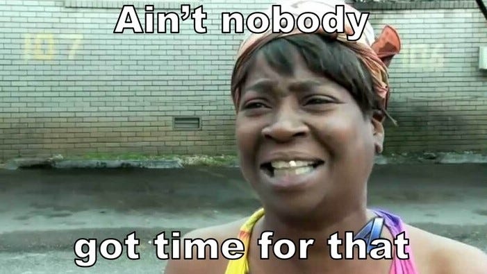I’ve been shooting for three posts a week, which for now is just about all I can handle as I have several other (paying) jobs—plus a husband and kids and cats and a TBR pile a mile high and a house that is not self-cleaning and a body that needs moving—and each post can take me a day or more to research and write and sprinkle with amusing memes and hopefully make funny AF.