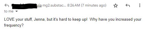 It wasn’t have you increased your frequency; as in, “Is it my imagination or am I enjoying the delight that is your writing even more often than I used to?” The guy wanted to know why. Maybe I’m a tiny bit defensive shut up dear nobody asked you, but I heard, “Whoa, you might want to pump the brakes a little, toots. Ain’t nobody got time for this much Jenna.”